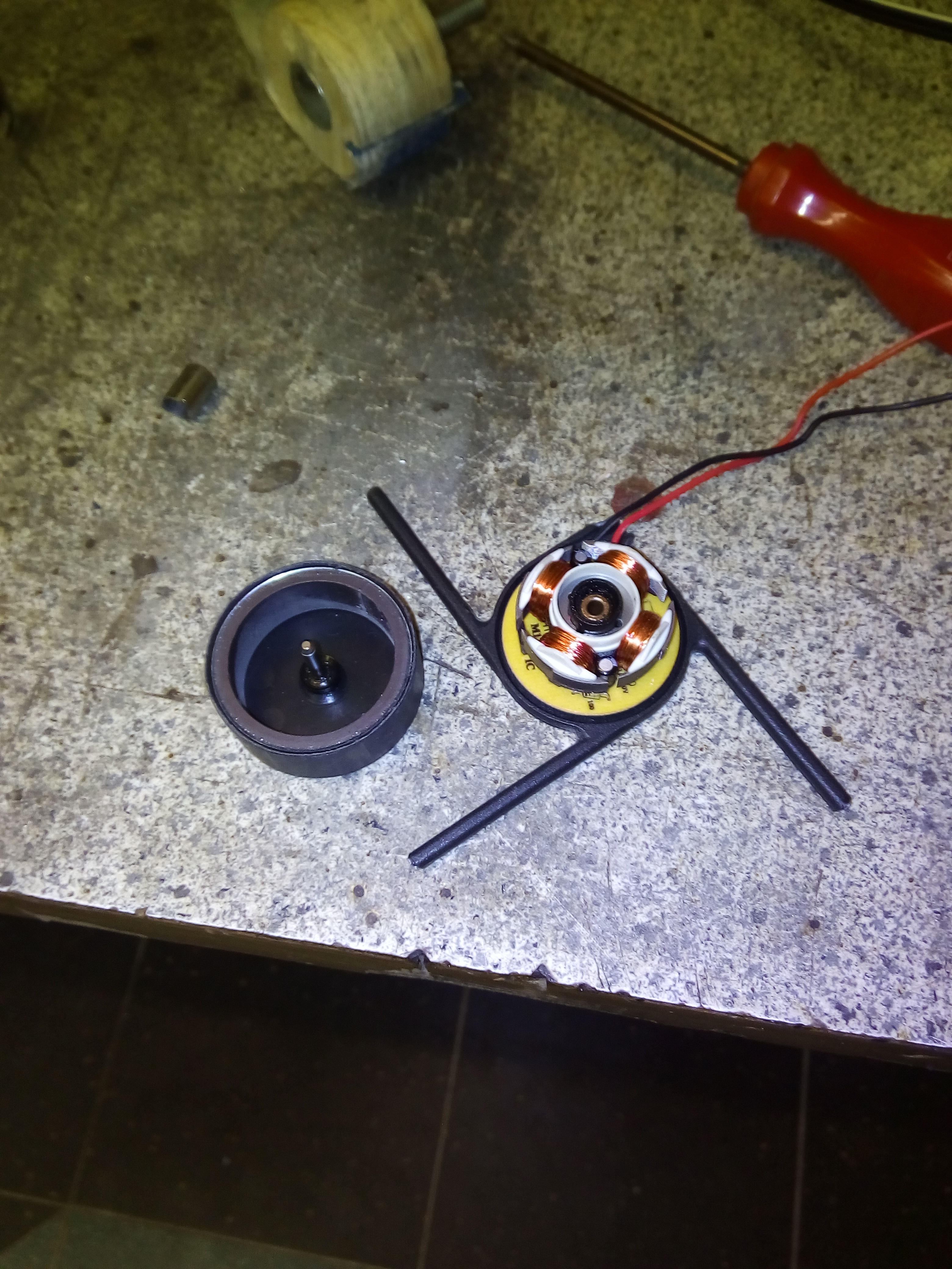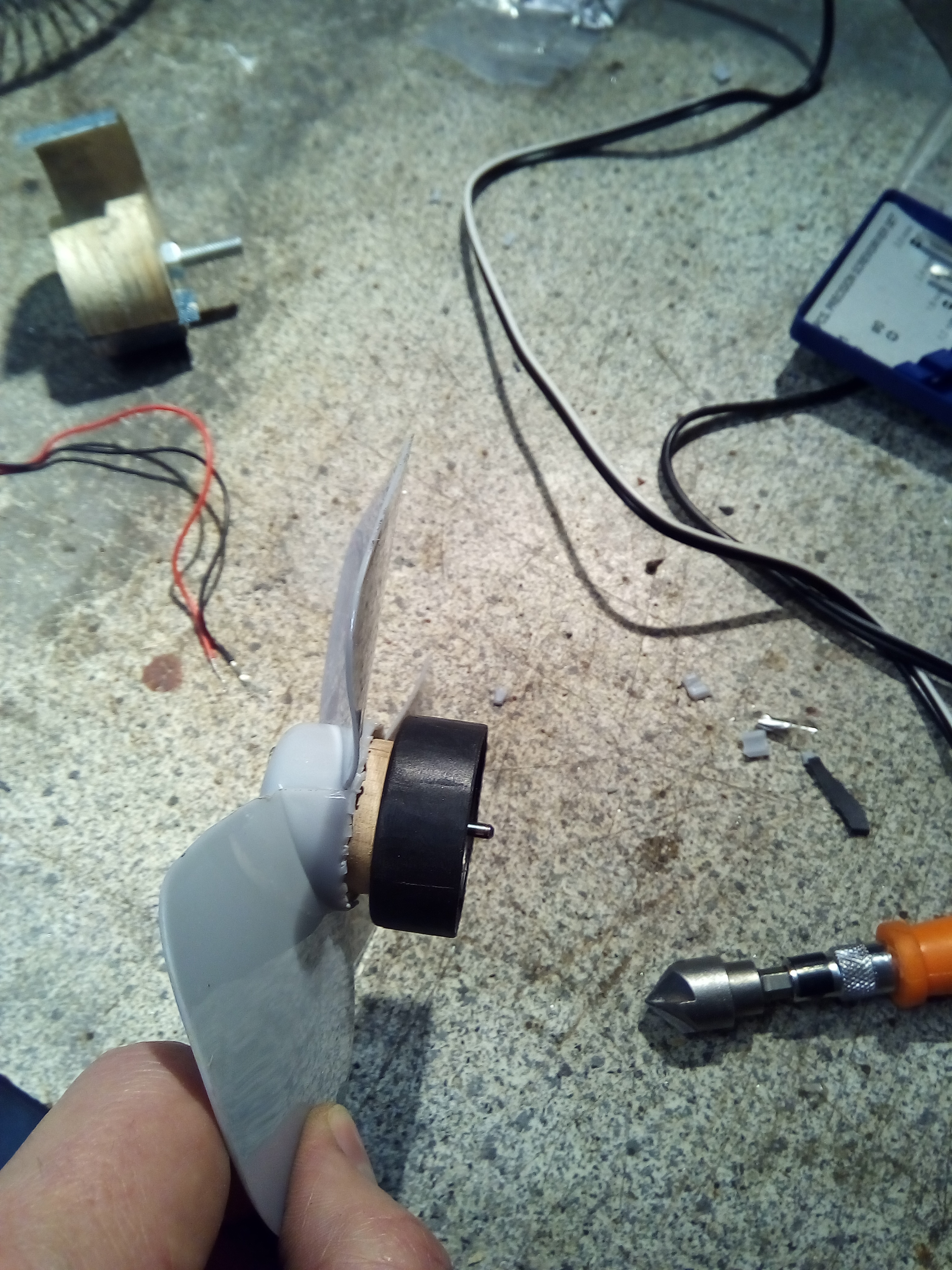 , в которую встроены магниты и ось, через деревянную шайбу-адаптер прикрепить пропеллер от авто-вентилятора. Очень кстати оказались всякие мелкие шурупчики от разборки старого компа, остатки старых наушников (они пошли на основание для крепления к станишкам).