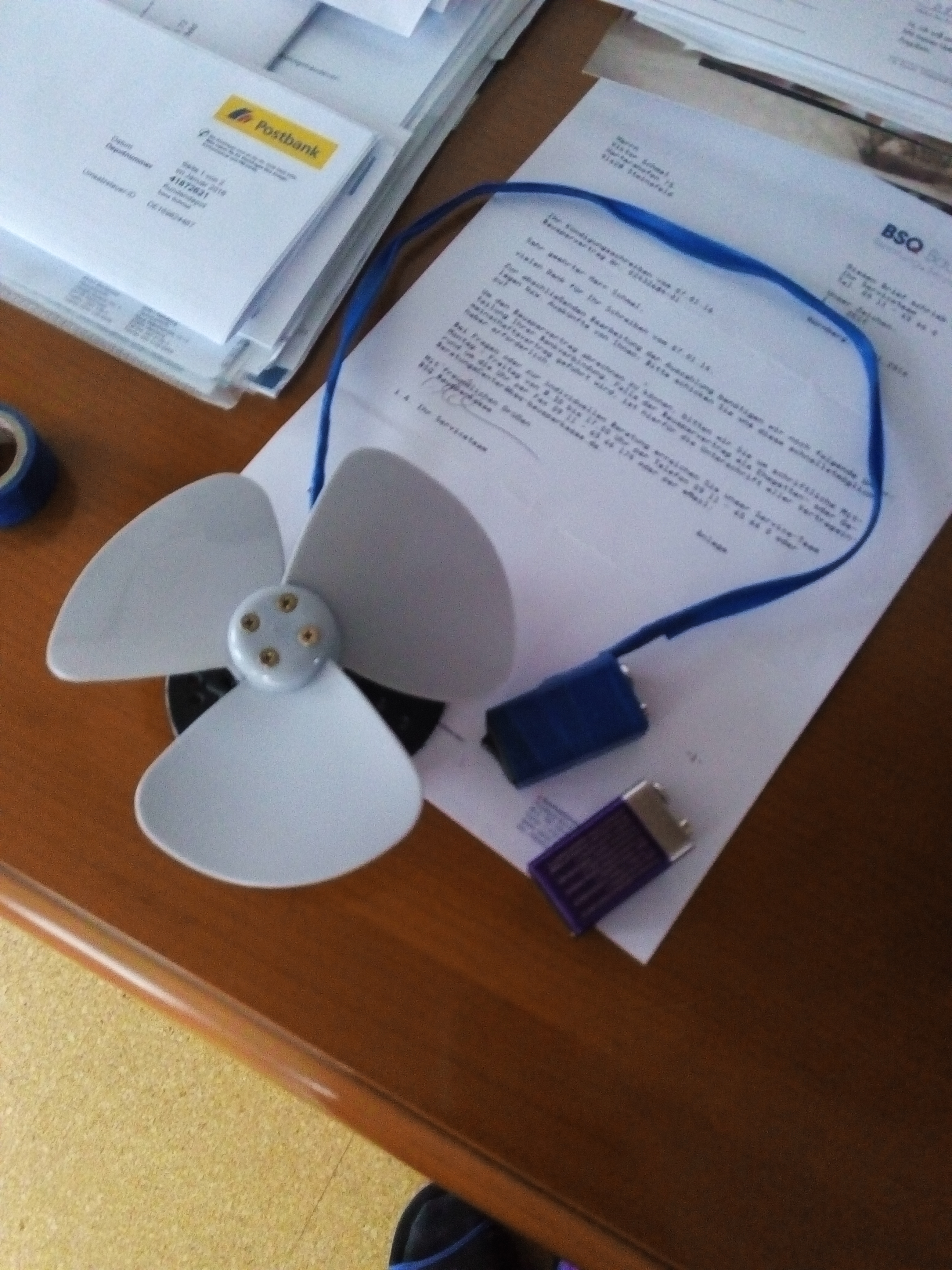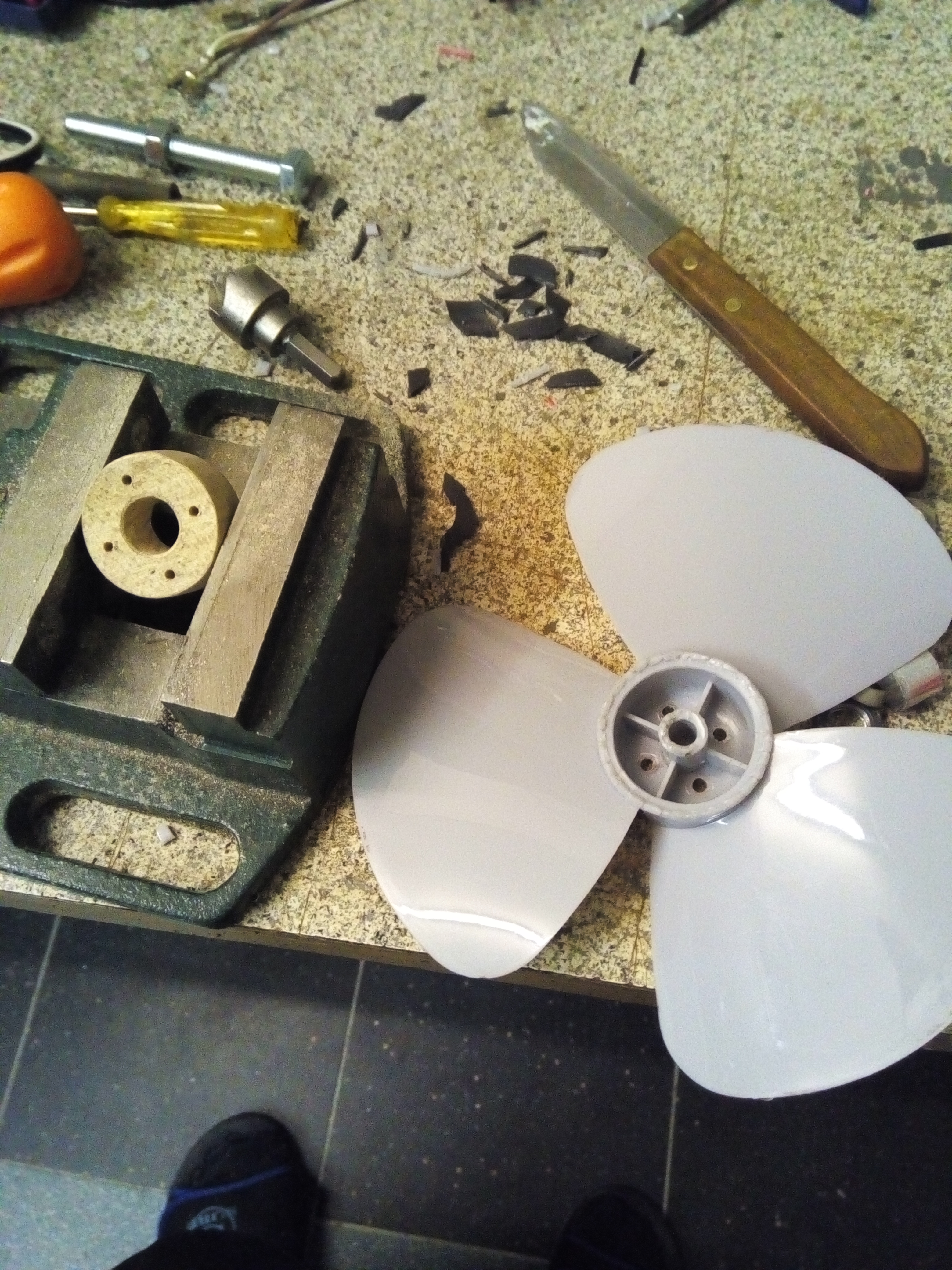 ? Из автомобильного, 12-ти вольтового вентилятора. Мотор оказался слишком громоздким/тяжёлым и был заменён на вентилятор компутерного блока питания. Для этого пришлось удалить лопости, обработать напильником и к получившейся ступице