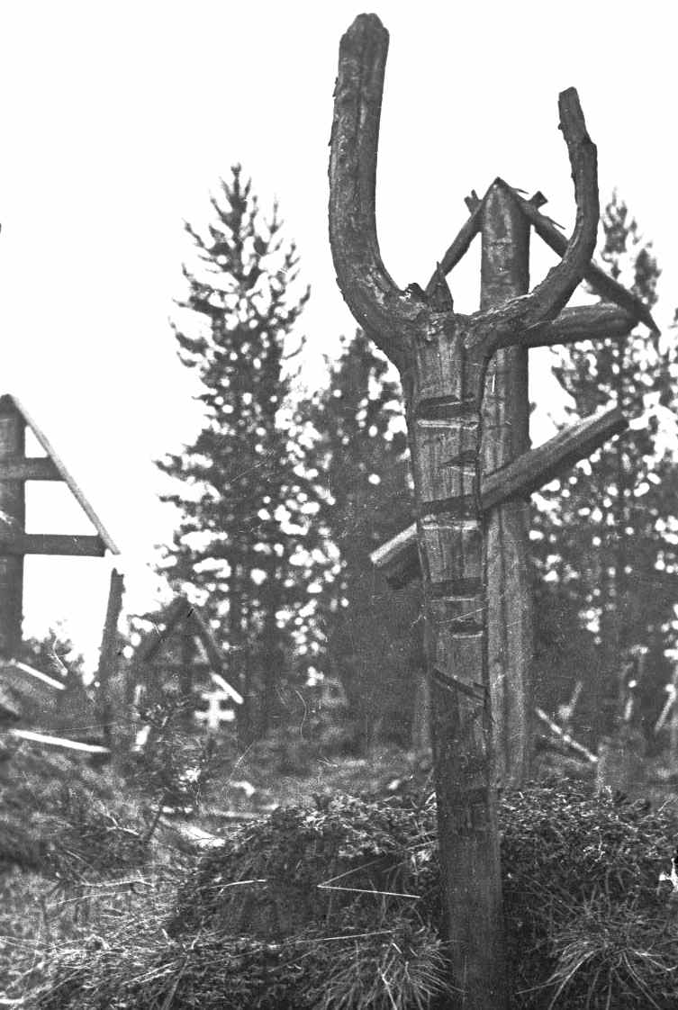 Зарубки на крестах - предположительно имена охотников.