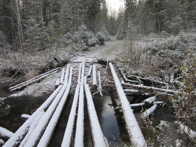 К этому времени повалил снег. Снегопад был настолько силен, что своих следов через несколько минут уже было не видно. Мы вернулись на дорогу, нашли отвилок и пошли прогуляться и по нему. Глинистая колея пошла вниз по склону. Нам уже было понятно, что вряд ли эта колеястая с бревнами дорога является правильным путем на Княжную пустынь, но было интересно, куда же она приведет.