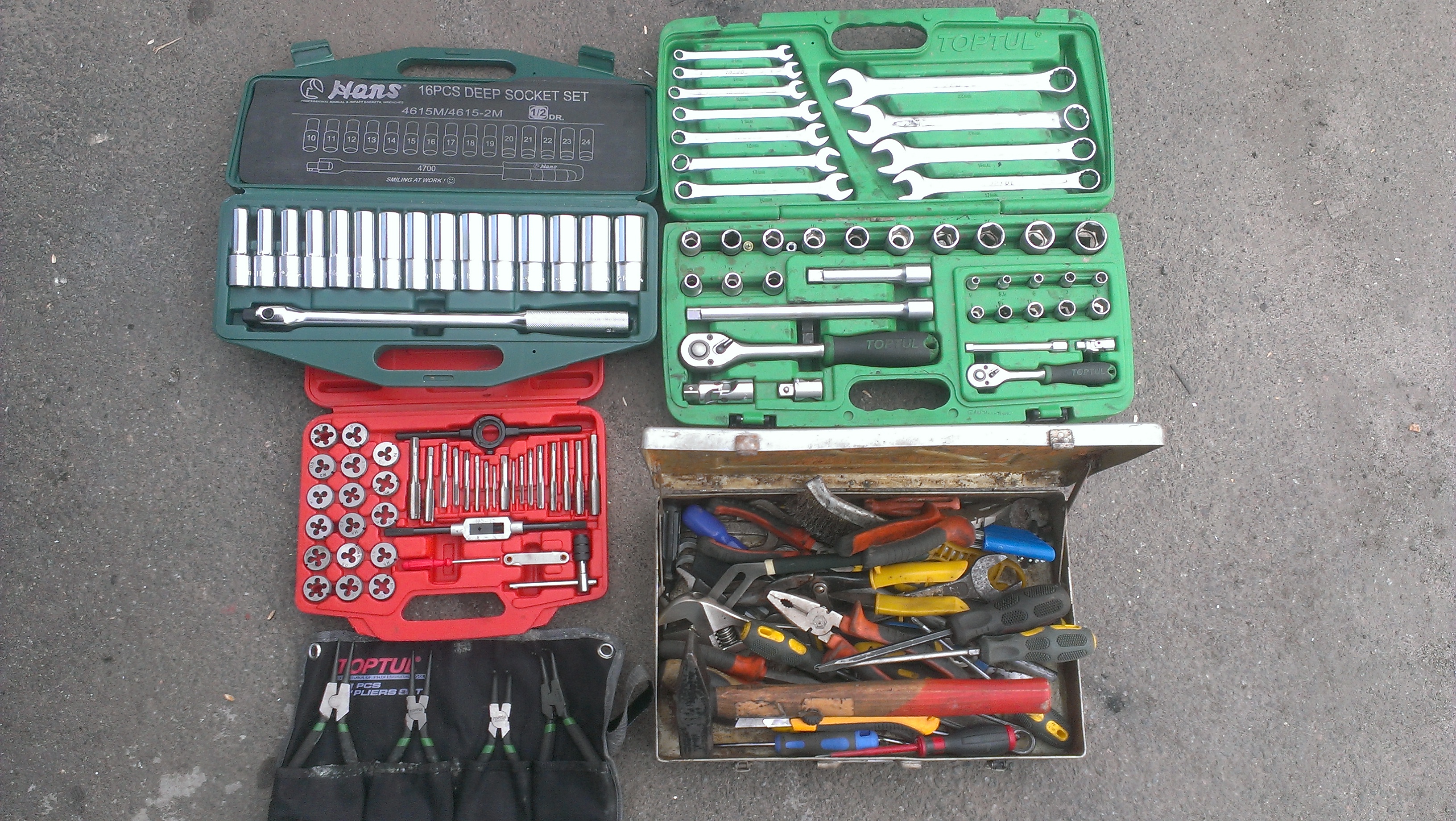 В итоге - два набора головок и ящичек россыпью: отвертки, разводной и газовый ключ, молоток, щетки по металу и т.д. и т.п...