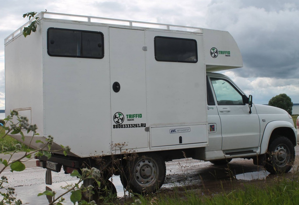 PS Вот из сети еще вариант съемного дома на колесах. Подумалосm: добавить к нему телескопические ноги. Тогда можно так. Приехал на относительно проезжее (с таким громоздким и тяжелым и валким домом)место, на берегу реки красивом остановился. Ноги выпустил, выехал из под дома автомобилем. На дверь замок повесил и поехал кататься с лебедкой по лесу по злым местам и дорожкам. Для улучшения развесовки (головастика бед домика)можно какой нить балласт за задним свесом на это время вешать. Например, емкости пластиковые водой из реки наполнять, или железный ящик песком. Покатался , все объехал - посмотрел, вернулся к домику. Правда получается кабина малеьнкая на 2-х человек максимум такой вариант.