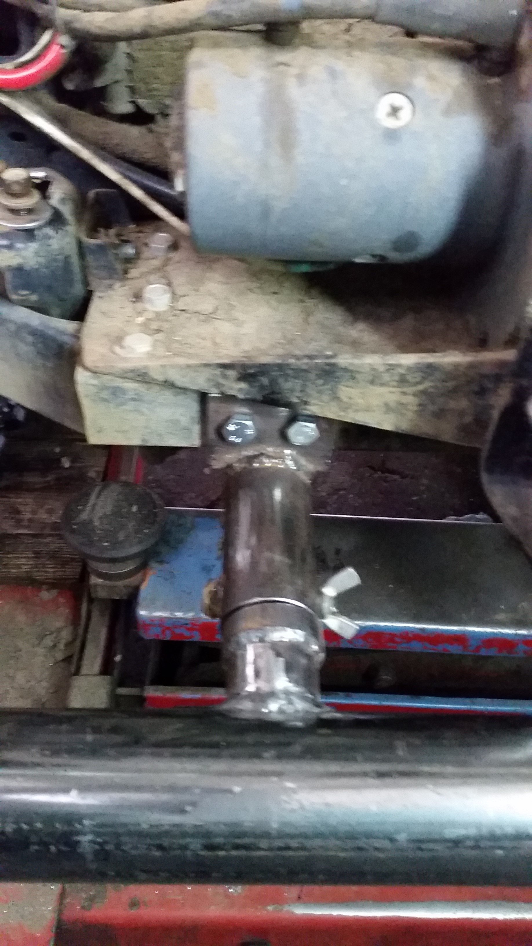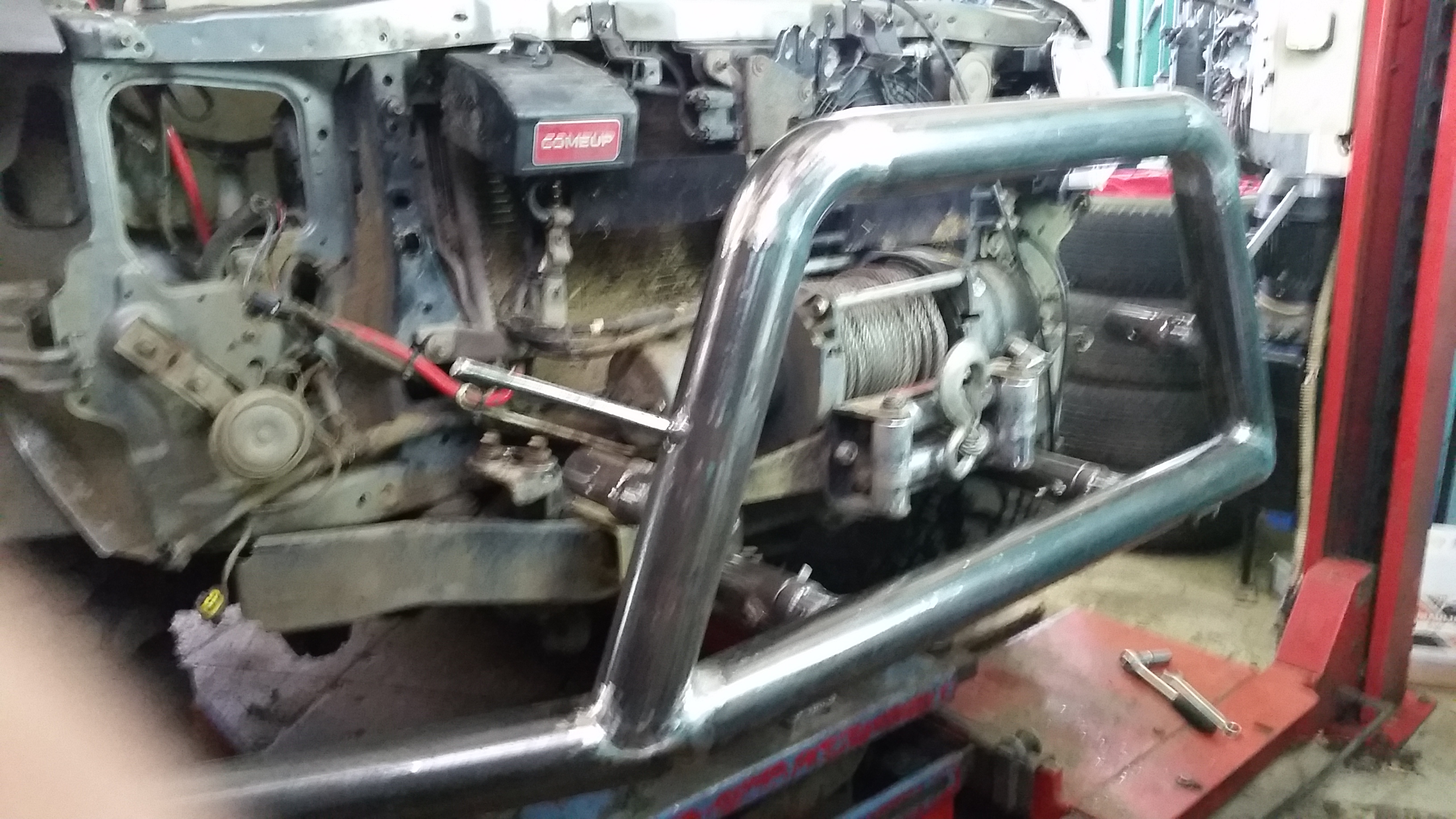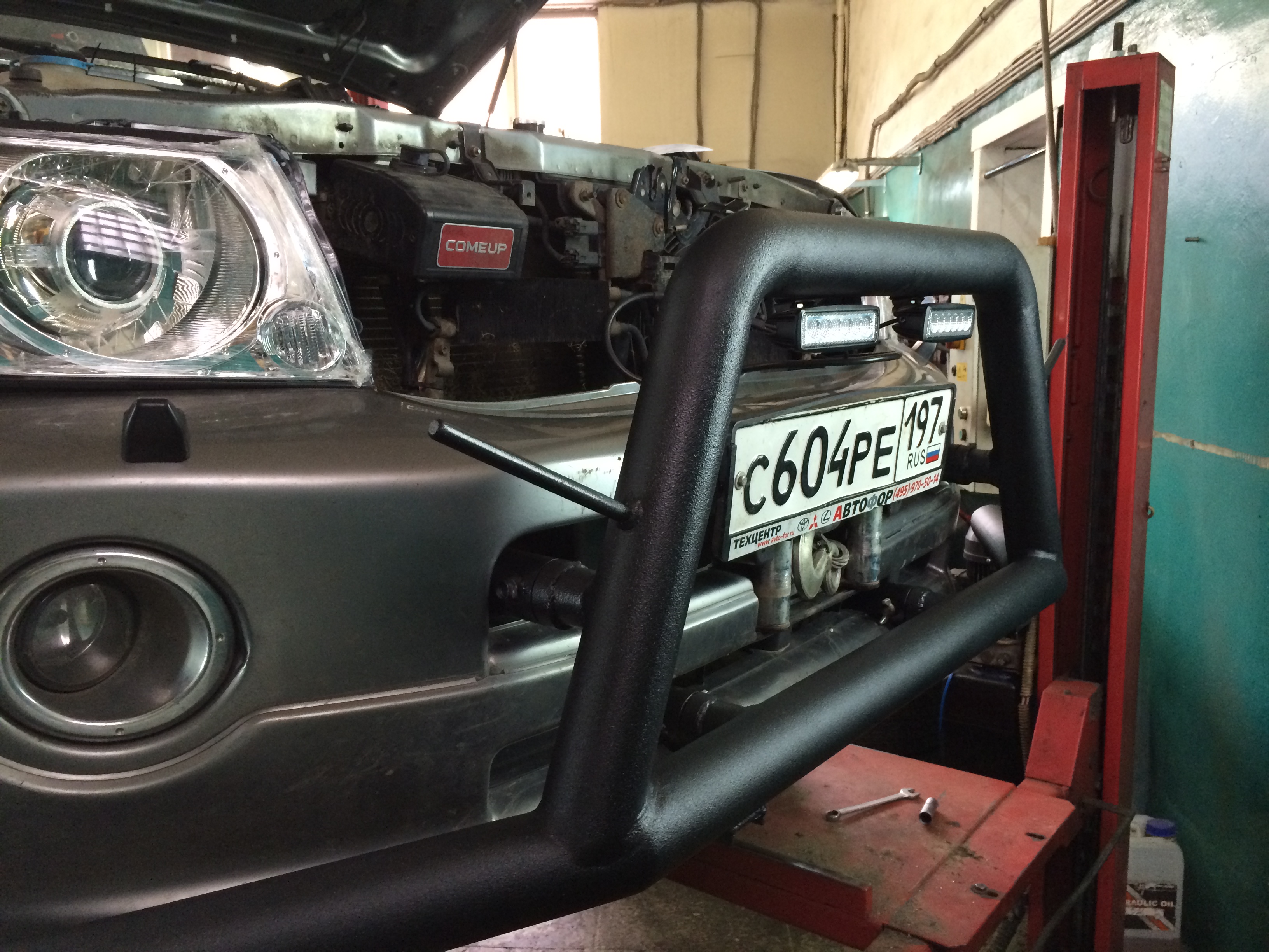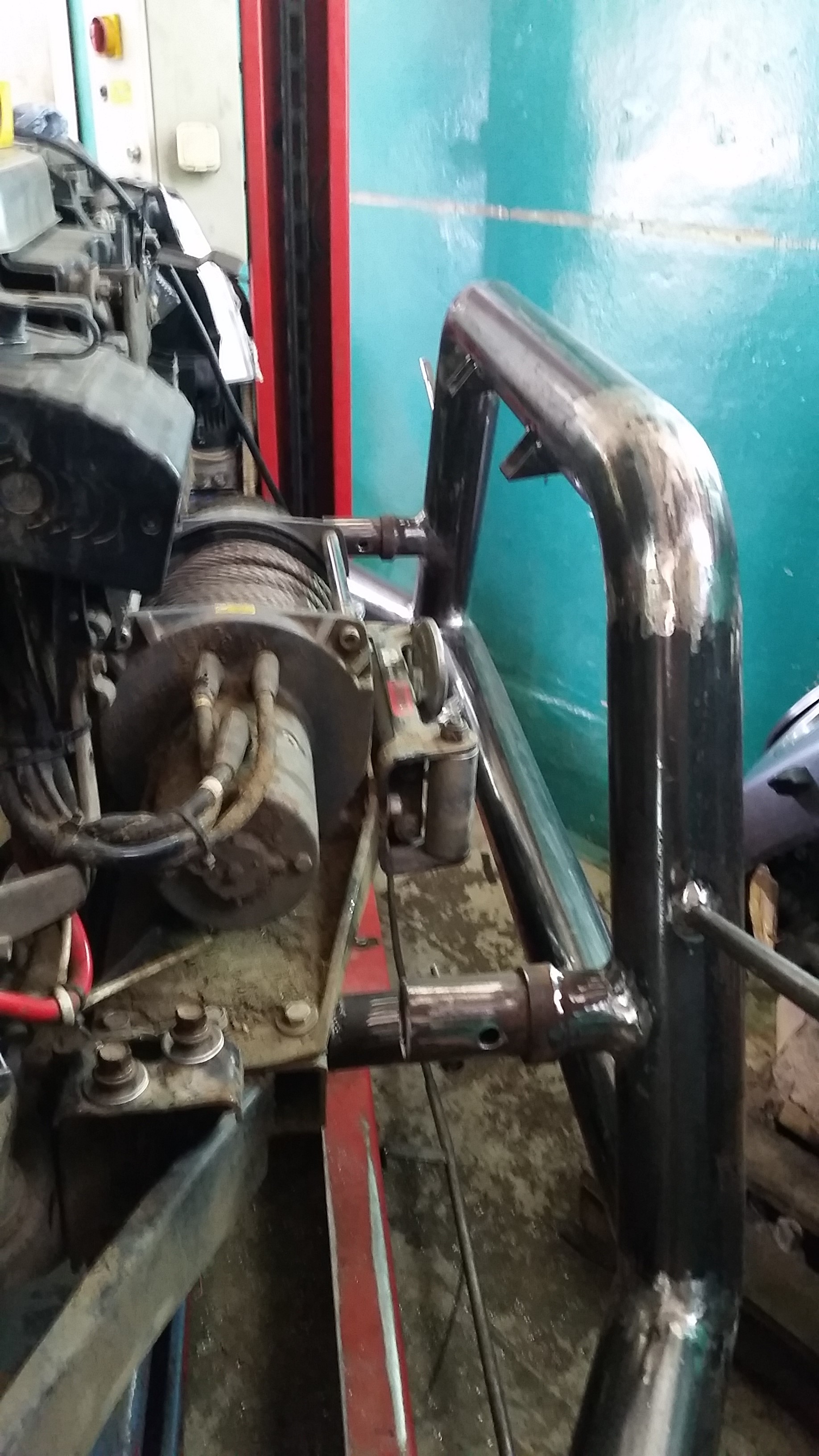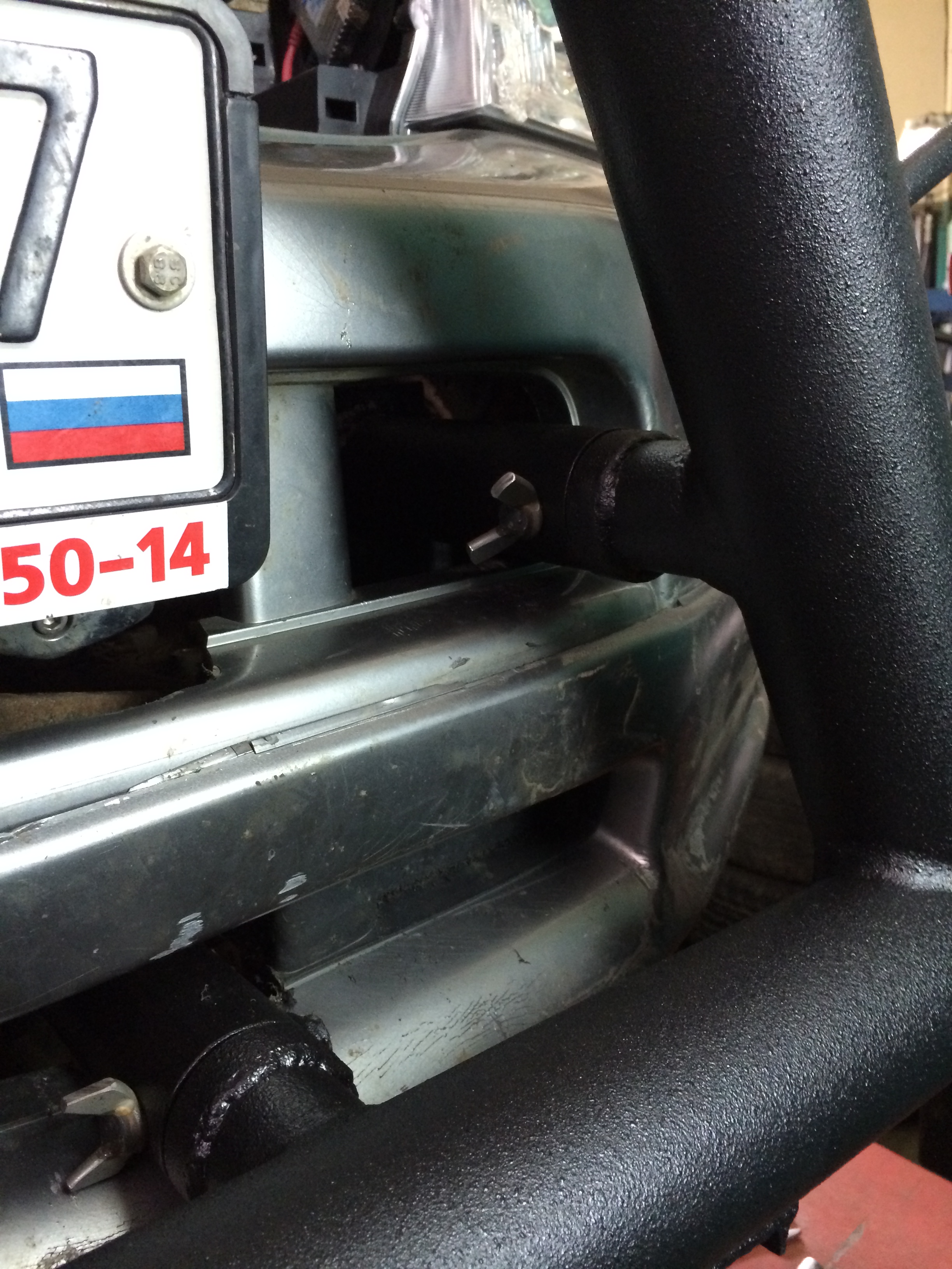 Силовой кенгурин весом 18 кг. 4-ре точки крепления на раму (траверса на нижние крепления и надстройка на верхнее) Кенгурин съемный (4-ре болта) при ненужности снимается и убирается в гараж. Бампер резать не пришлось, только немного подточить. Кенгурин защищает бампер, радиатор. За него можно поднимать машину хай джеком (правда испытания еще не проводились). На «усы» кенгурина наматывается трос от лебедки. Дергать за кенгурин категорически нельзя.