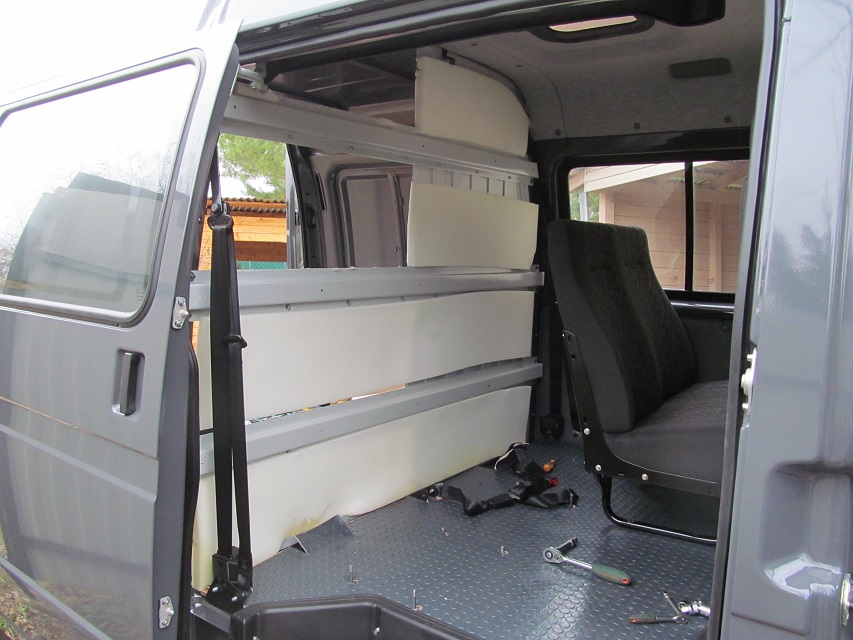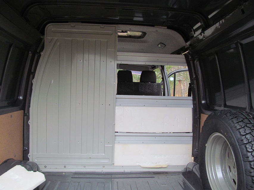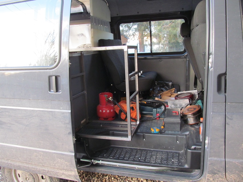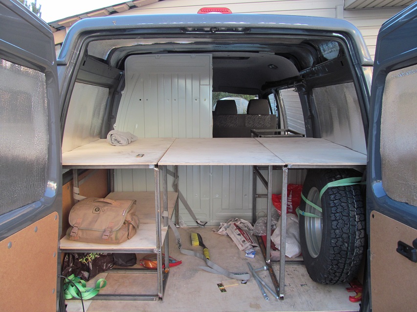- Из профиля 25х25, сварил стеллажи и винтами прикрепил к полу и каркасу перегородки. Средняя часть спальника будет подъемной, для перевозки негабарита и доступа к багажу из салона.