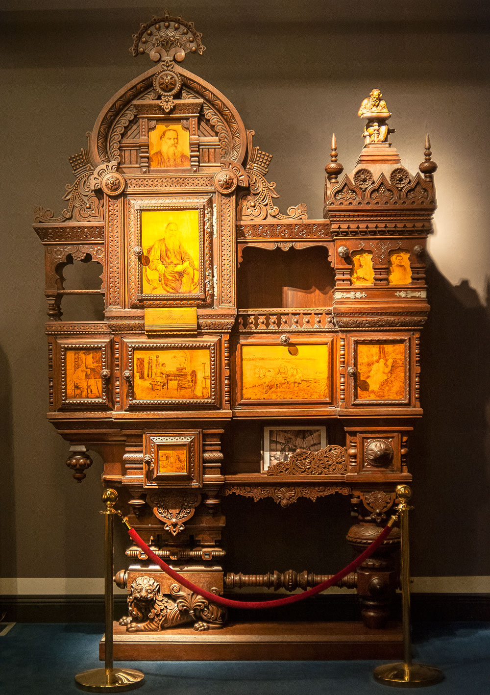Удивительное рядом. На выставке "Художественные сокровища России" демонстрировался вот такой замечательный резной шкаф 1892 г. для изданий Л.Н.Толстого. И чем то он мне очень очень напоминал знаменитый Асташевский терем , построенный Сазоновым в 1897 г. Посмотрите: главка с портретом писателя почти точно повторяет очертания такого же украшения терема в проекте. Что же оказалось? Автор этих произведений один! Иван Павлович Ропет! Такой вот одаренной творческой и многогранной личностью был, оказал огромное влияние на развитие "Русского стиля" в архитектуре. И шкаф Лев Толстой на выставке в Чикаго - его работа. И волшебный терем в костромской глуши непролазной, тоже его работа! Нам есть кем гордиться!